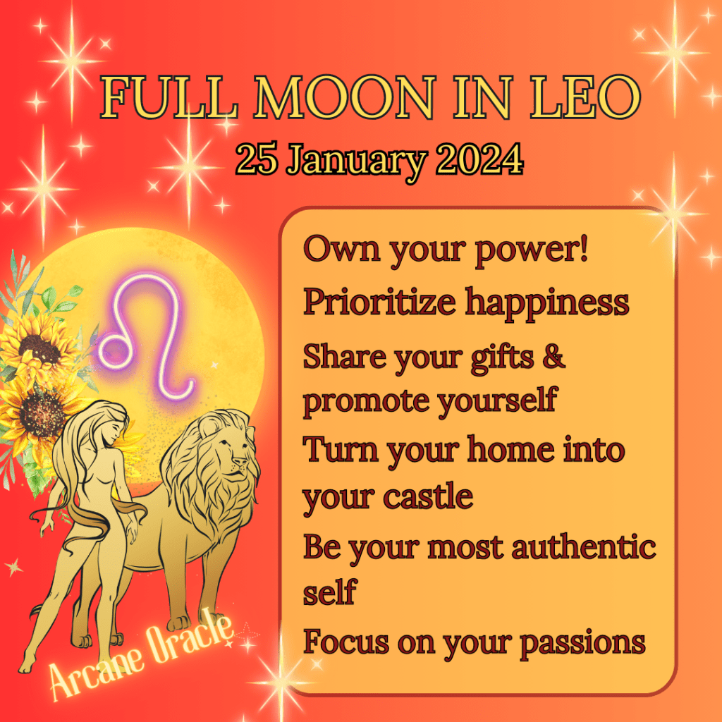 Leo, the majestic lion of the zodiac, is a symbol of courage, strength, and authentic self-expression. This full moon invites us to bask in the radiant glow of our own inner light, to channel the fearless and regal spirit of Leo, and to embrace our own sovereignty over our lives.